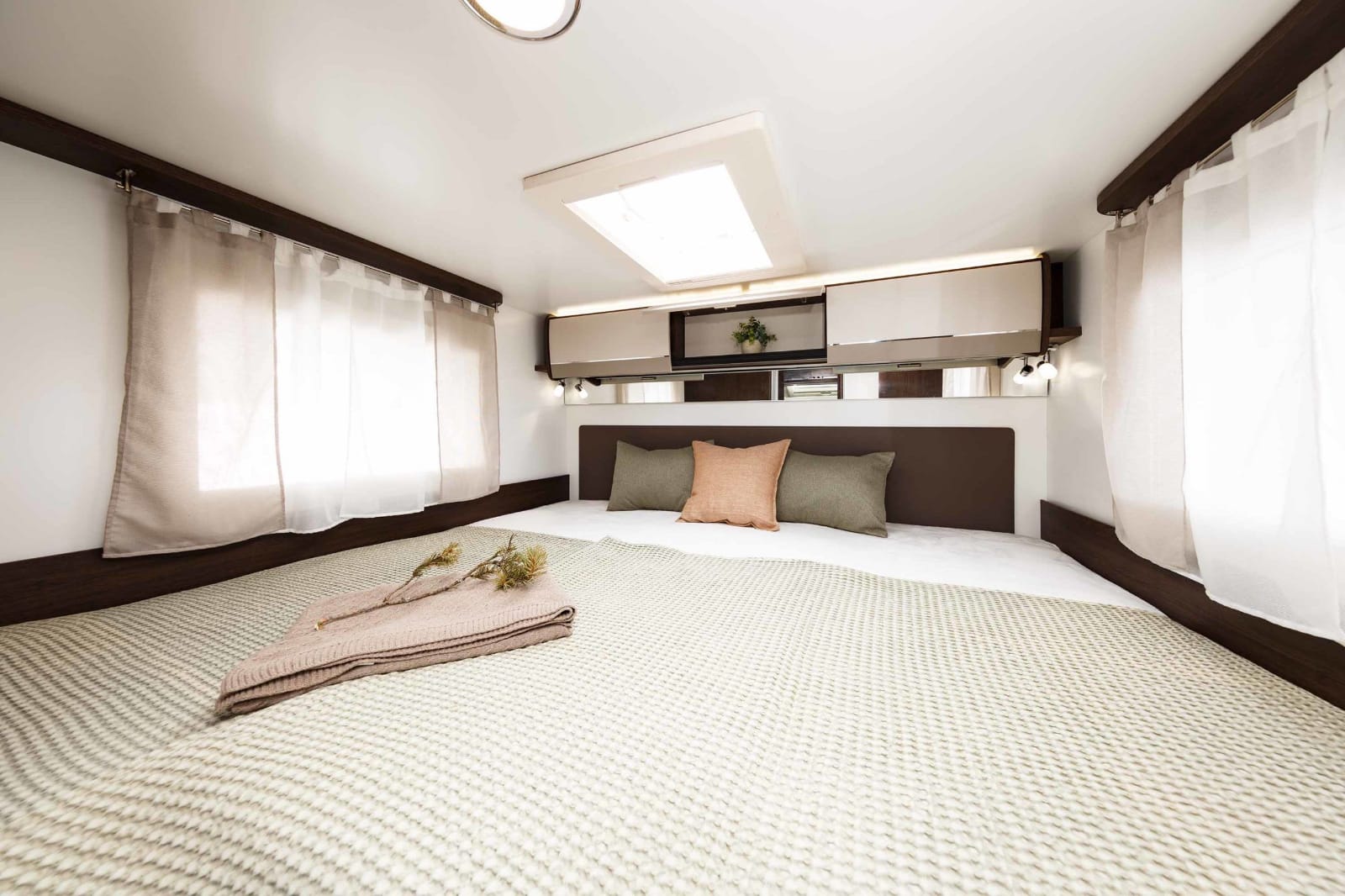 Distribución: Cama trasera en isla (salida por ambos lados), Comedor face to face, Cama basculante y accionable automáticamente (Opcional), Baño independiente de cabina ducha.